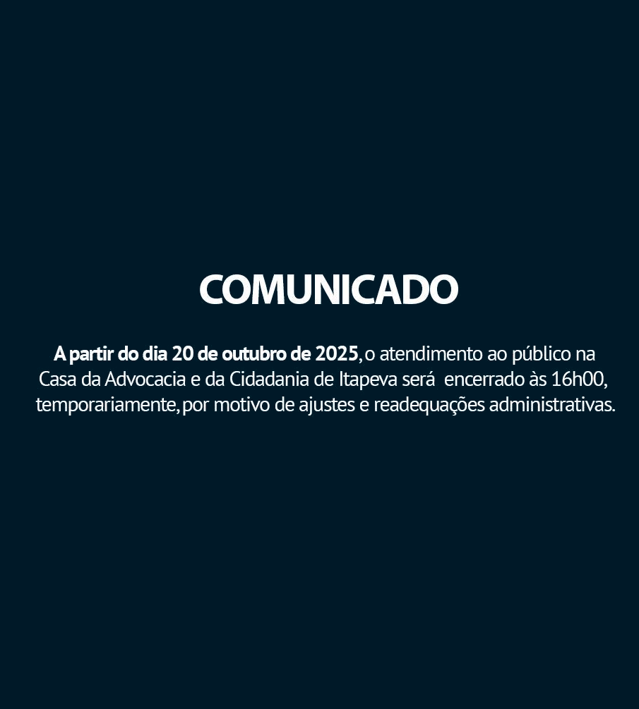 A partir do dia 20 de outubro de 2025, o atendimento ao público na Casa da Advocacia e da Cidadania de Itapeva será encerrado às 16h00, temporariamente, por motivo de ajustes e readequações administrativas.