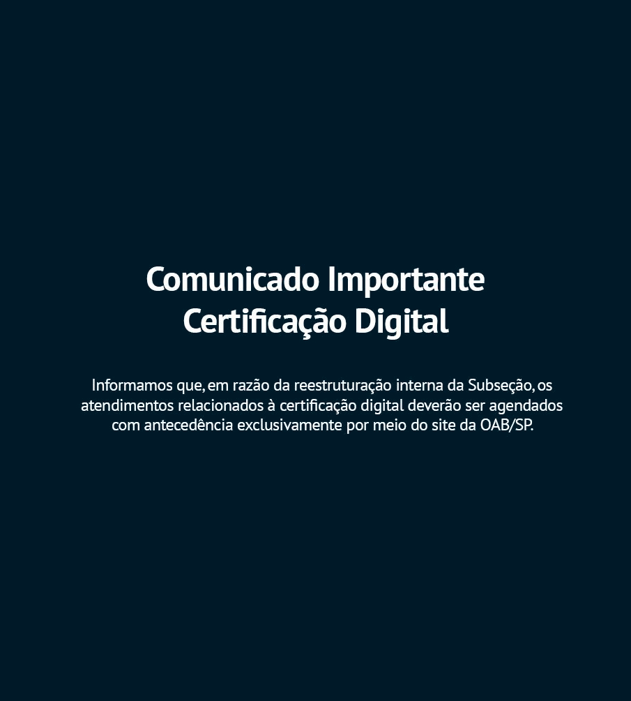 Informamos que, em razão da reestruturação interna da Subseção, os atendimentos relacionados à certificação digital deverão ser agendados com antecedência exclusivamente por meio do site da OAB/SP.