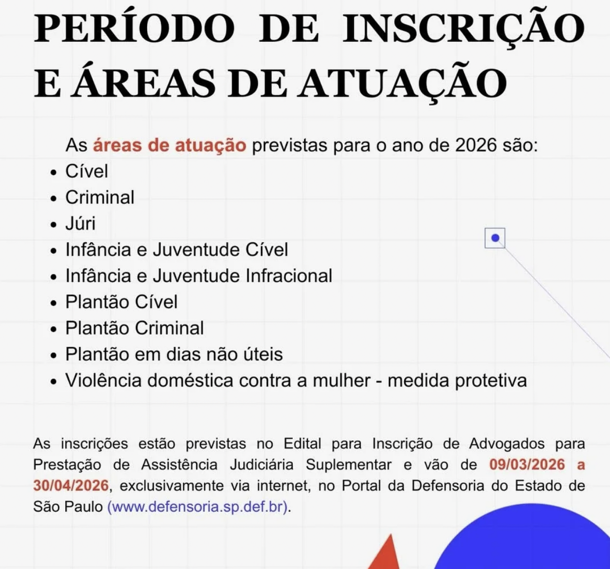 As inscrições estão previstas no Edital para Inscrição de Advogados para Prestação de Assistência Judiciária Suplementar e vão de 09/03/2026 a 30/04/2026, exclusivamente via internet, no Portal da Defensoria do Estado de São Paulo (www.defensoria.sp.def.br).